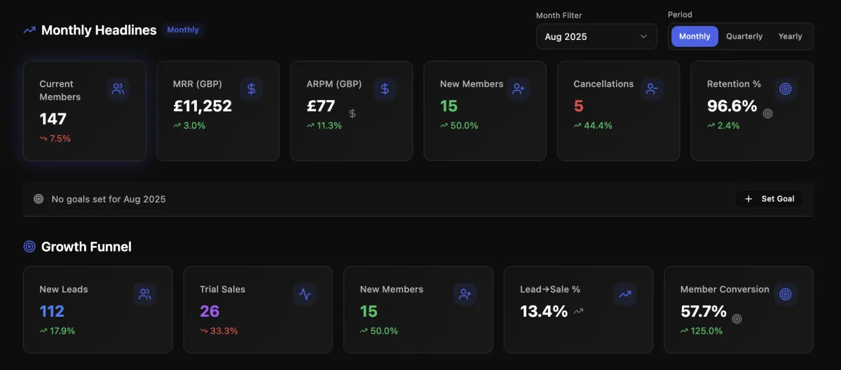 See your key numbers populate instantly: MRR, ARPM, Churn, Conversions & Attendance